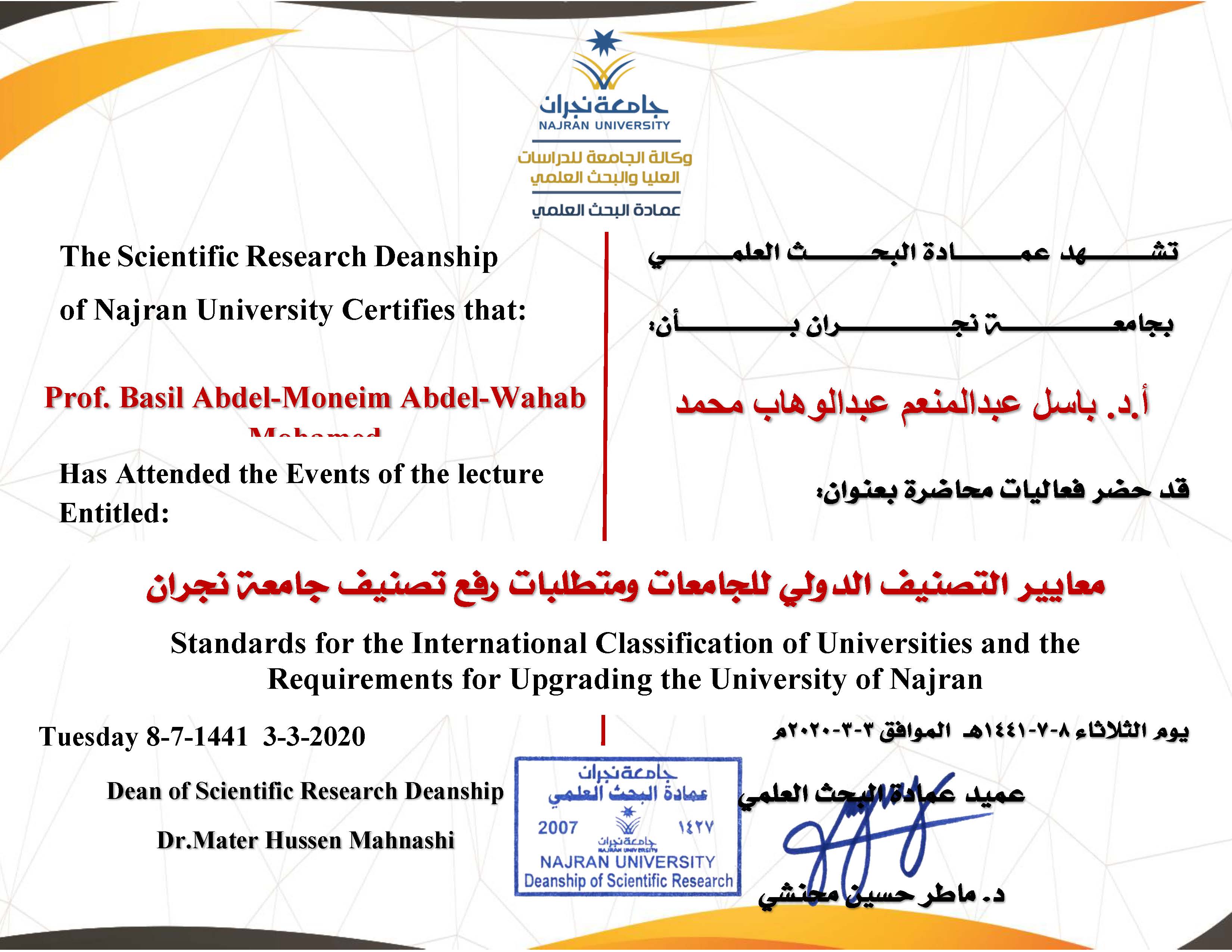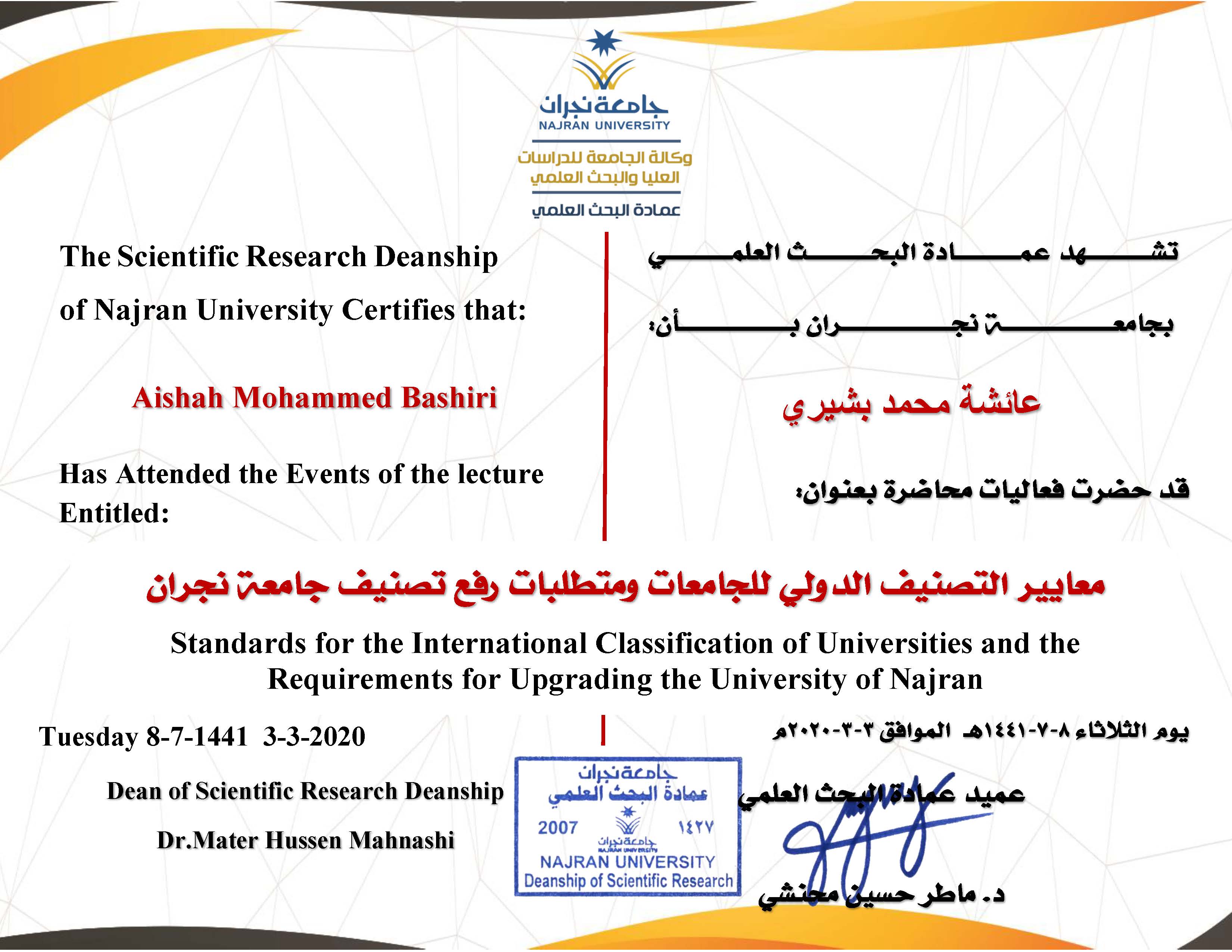 4- المحاضرة العلمية الرابعة معايير التصنيف الدولي للجامعات ومتطلبات رفع تصنيف جامعة نجران - وكالة البحث العلمي